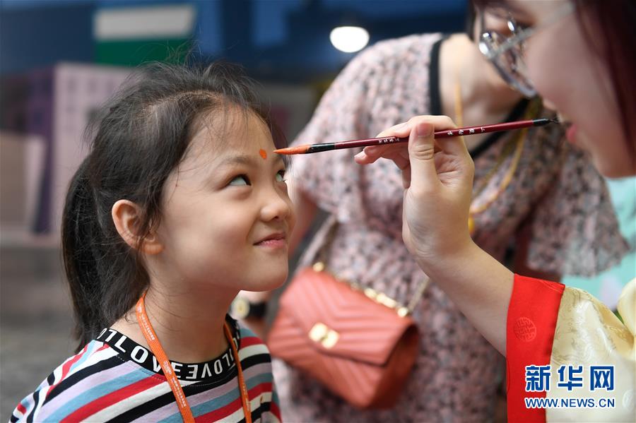 6月7日,小朋友在浙江省杭州市青少年发展中心“Do都城”举办的活动中体验点雄黄民俗。