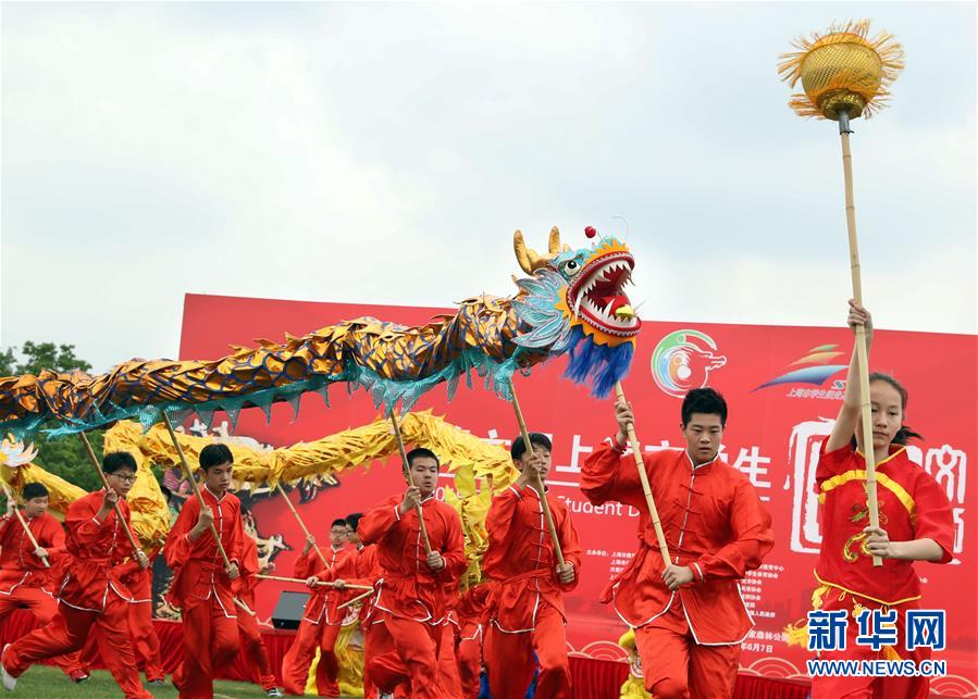 6月7日,同济大学附属七一中学的学生在上海海湾国家森林公园舞龙。新华社记者 刘颖 摄