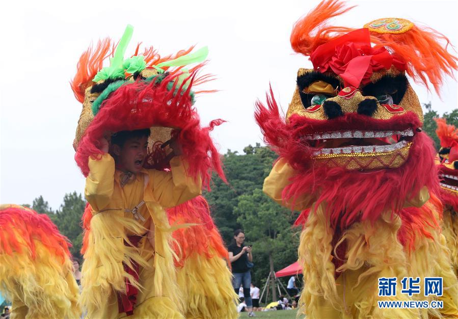 6月7日,上海市育人中学学生在上海海湾国家森林公园舞狮。新华社记者 刘颖 摄