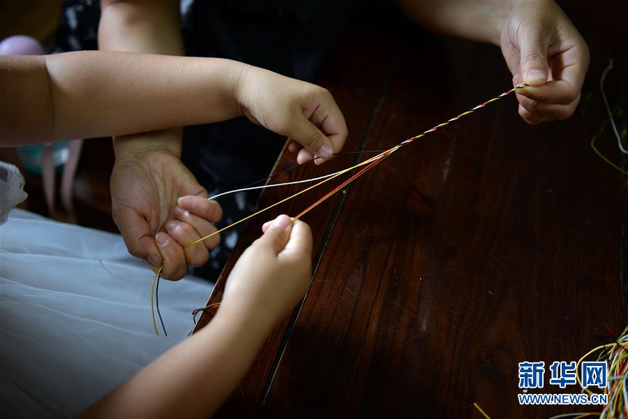 6月7日,小朋友和家长在山东聊城海源阁编制五彩绳。新华社发(孔晓政摄)
