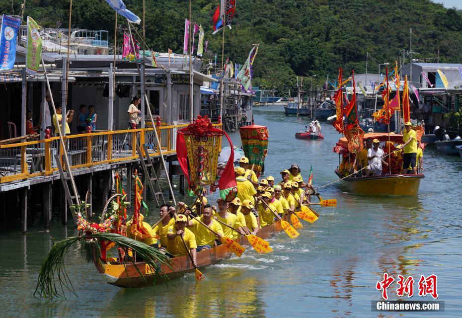 6月7日是农历五月初五端午节,香港大澳举行一年一度的端午龙舟游涌活动。这项拥有一百多年历史的独特节庆活动自2011年起被列入中国国家级非物质文化遗产名录。由大澳的三个渔业行会(扒艇行、鲜鱼行和合心堂)组织的三艘龙舟拖着载有神像的“神艇”巡游大澳水道,并沿途祭扫祈福,保佑水陆居民幸福安康。图为合心堂的龙舟拖着“神艇”巡游大澳水道,当地居民在棚屋上观看。中新社记者 张炜 摄