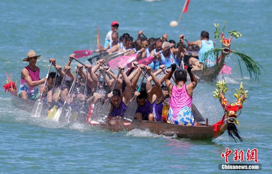 6月7日是农历五月初五端午节,香港大澳举行一年一度的端午龙舟游涌活动。这项拥有一百多年历史的独特节庆活动自2011年起被列入中国国家级非物质文化遗产名录。由大澳的三个渔业行会(扒艇行、鲜鱼行和合心堂)组织的三艘龙舟拖着载有神像的“神艇”巡游大澳水道,并沿途祭扫祈福,保佑水陆居民幸福安康。图为龙舟游涌庆典期间举行龙舟竞渡比赛。中新社记者 张炜 摄