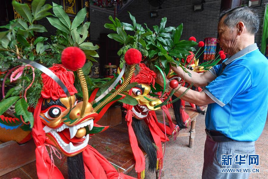 车陂尚书王公祠供奉着王太原龙船会五条龙舟的龙头龙尾(5月21日摄)。新华社记者刘大伟摄
