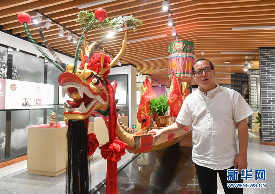 广州市龙舟文化非遗传承人,车陂村民苏应昌在龙舟文化展览馆介绍一个龙舟模型(6月4日摄)。新华社记者刘大伟摄