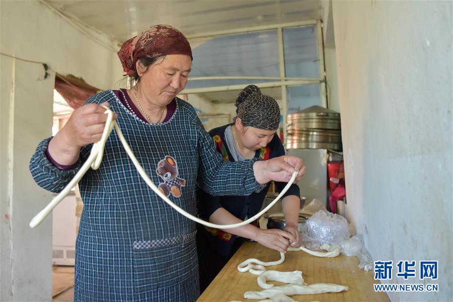 客栈女主人革命古丽·沙拉提(左)和儿媳为游客制作拌面(6月6日摄)。 新华社记者 丁磊 摄