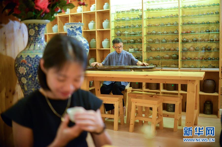 在马来西亚吉隆坡,邢福荣的茶友陈国兴(右)演奏古琴(5月24日摄)。