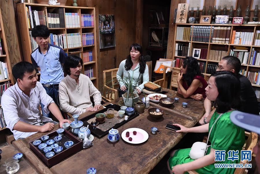 “新村民”在龙潭村的“随喜书屋”交流创业心得(6月11日摄)。 新华社记者 林善传 摄
