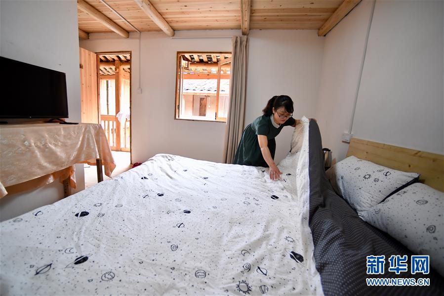 返乡创业、开办民宿的龙潭村村民毛小云在整理房间(6月12日摄)。毛小云与丈夫投资30多万元对自家老屋进行了修复、改造,建成“龙潭云居”民宿。 新华社记者 姜克红 摄