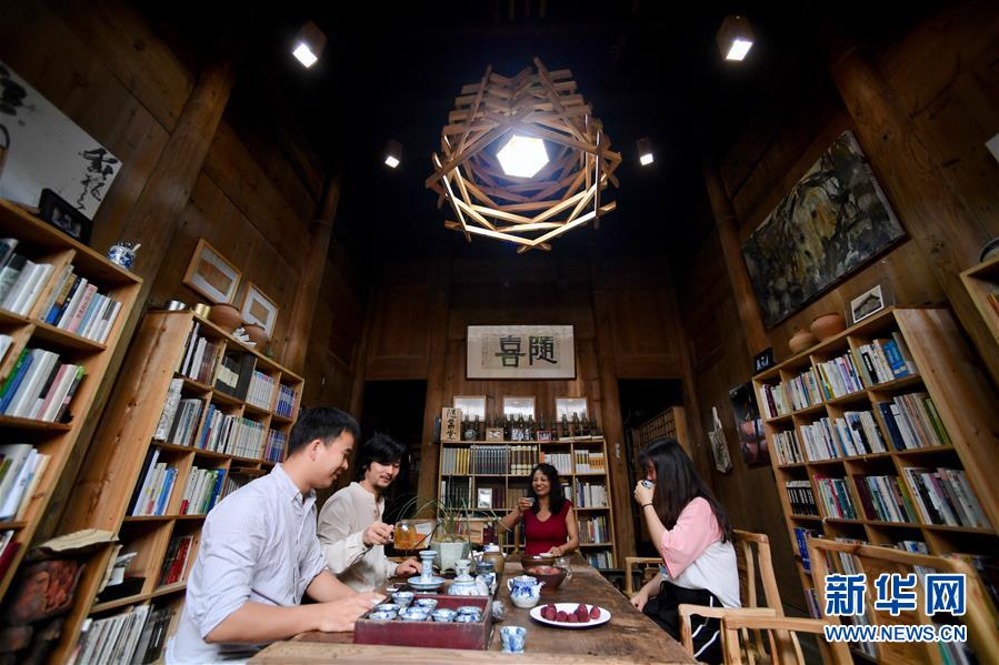 一个古村的“文艺复兴” 在龙潭村“随喜书屋”,来自江西的曾伟(左二)和其他几位定居龙潭村的“新村民”喝茶聊天(6月11日摄)。2017年8月,曾伟跟随文创团队到龙潭村考察,随后他便租下一幢即将坍塌的老宅改造成书屋,从事网络图书经营,顺便将龙潭的特产介绍给外地的朋友。 新华社记者 姜克红 摄