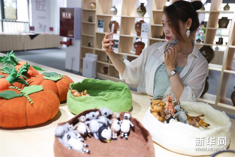 6月16日,在会东县金江文化创意产业园里,一名游客和手工羊毛毡制品合影。 近日,四川省凉山彝族自治州会东县金江文化创意产业园开园。这座集孵化、服务、推广、研发于一体的文化创意产业园由县城的老建筑“老电影院”改造而成,建筑面积1万余平方米,包含创意设计服务、文创企业孵化、新媒体推广和文创产品研发等四大平台,致力于本土传统手工艺品、非遗文化、旅游资源的挖掘和融合等。 新华社记者 江宏景 摄