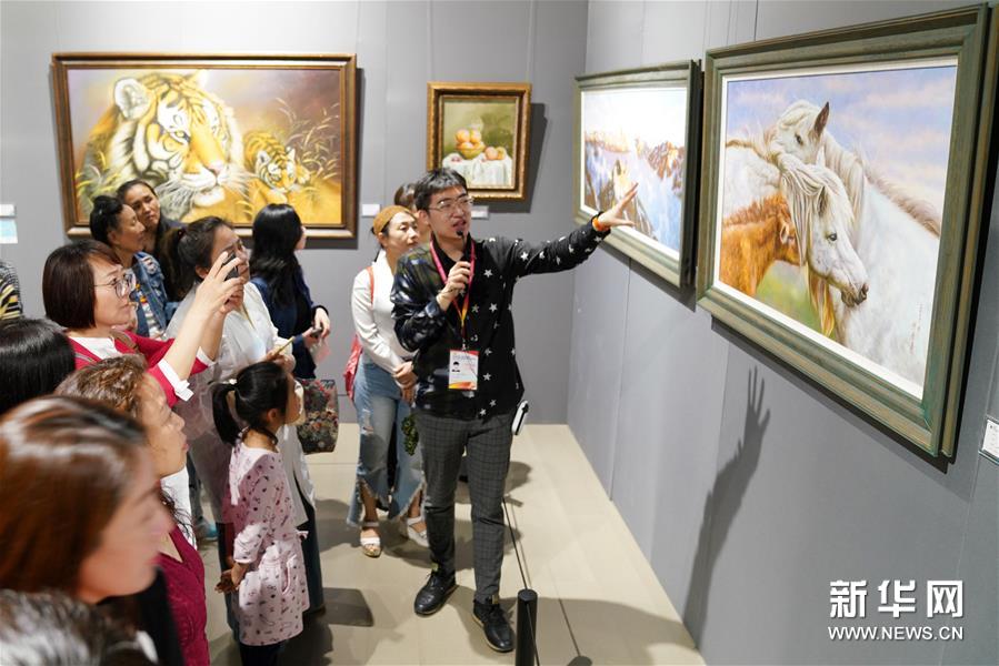 6月16日,在哈尔滨国际油画展上,工作人员在为参观者介绍作品。 6月15日,作为第六届中俄博览会的重要文化项目,为期5天的“暖——我的心靠近你就有光明”第七届中国·哈尔滨国际油画展在哈尔滨国际会展中心开幕。展览展出了来自俄罗斯、中国、朝鲜等国家的油画、雕塑等各类艺术品千余件,吸引了众多参观者前来品鉴观赏。 新华社记者 王建威 摄