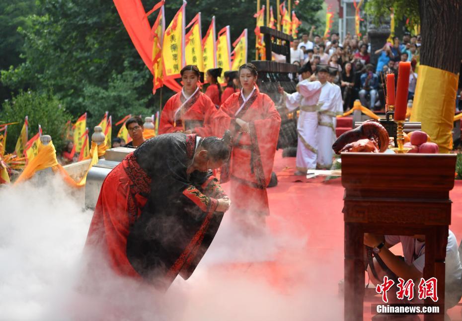 6月19日,河北美术学院在该学院文庙为1500余名毕业生举行“汉式”学士学位授予仪式。仪式现场,身着汉服的毕业生依次入殿,参加“正衣冠”“孝亲敬师”“扫浮尘”“荷花净水”等仪式,以三拜之礼感恩老师和父母,接受中华传统文化洗礼,开启人生新征程。图为甄忠义校长“开启”仪式。中新社记者 翟羽佳 摄