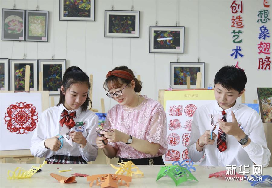 6月19日,河北省邢台市第五中学剪纸社团的学生在老师的指导下学习剪纸。 河北省邢台市第五中学把非遗传承与学校社团活动有机结合,开设多项非遗课程,让学生们在社团活动中学习、传承非遗技艺,感受传统文化魅力。 新华社发(张驰 摄)