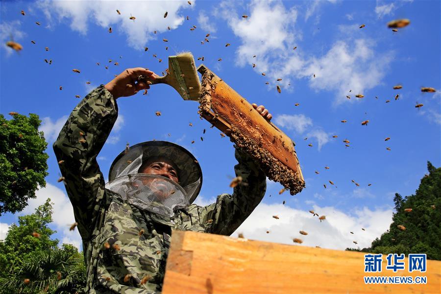 6月20日,在广西柳州市融水苗族自治县汪洞乡罗洞村,村民汪安仕在悬崖上采割夏至蜜。 时下,正是夏至蜜成熟的季节,广西柳州市融水苗族自治县汪洞乡罗洞村的蜂农们忙着采割夏至蜜,大山里一片忙碌景象。 新华社发(龙涛 摄)