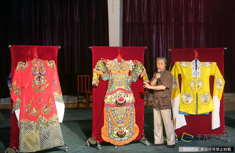北京京剧院剧装总监彭仲林讲解京剧服饰知识,详细说明了京剧服饰的色彩、图案、款式等艺术特性。千龙网记者纪敬摄