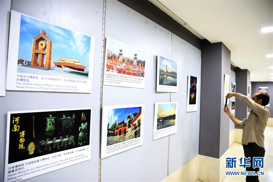 6月22日,在埃及首都开罗,一名男子参观中国河南旅游图片展。 2019年“功夫之旅-中国旅游文化周”22日晚在埃及首都开罗的伊斯兰艺术博物馆开幕。 新华社发(艾哈迈德·戈马摄)