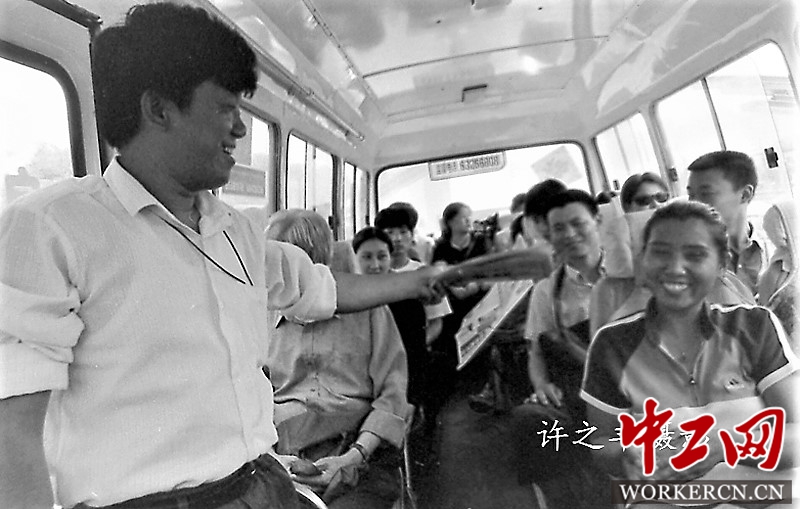 1999年6月中旬,北京长安街上有着招手即停的小公共。数次跟随一辆准运号为19041小公共,司机马全义售票员李国庆热情为乘客服务,在从公主坟到八王坟总长14.9公里的运营途中,哥俩轮流给乘客猜谜语、背台词、讲笑话,整个车厢充满欢声笑语,被人们称之为长安街上“快乐小巴”至今记忆犹新。图为作者20年前乘坐“快乐小巴”时的摄影记录。工人日报-中工网许之丰摄影报道