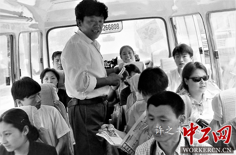 1999年6月中旬,北京长安街上有着招手即停的小公共。数次跟随一辆准运号为19041小公共,司机马全义售票员李国庆热情为乘客服务,在从公主坟到八王坟总长14.9公里的运营途中,哥俩轮流给乘客猜谜语、背台词、讲笑话,整个车厢充满欢声笑语,被人们称之为长安街上“快乐小巴”至今记忆犹新。图为作者20年前乘坐“快乐小巴”时的摄影记录。工人日报-中工网许之丰摄影报道