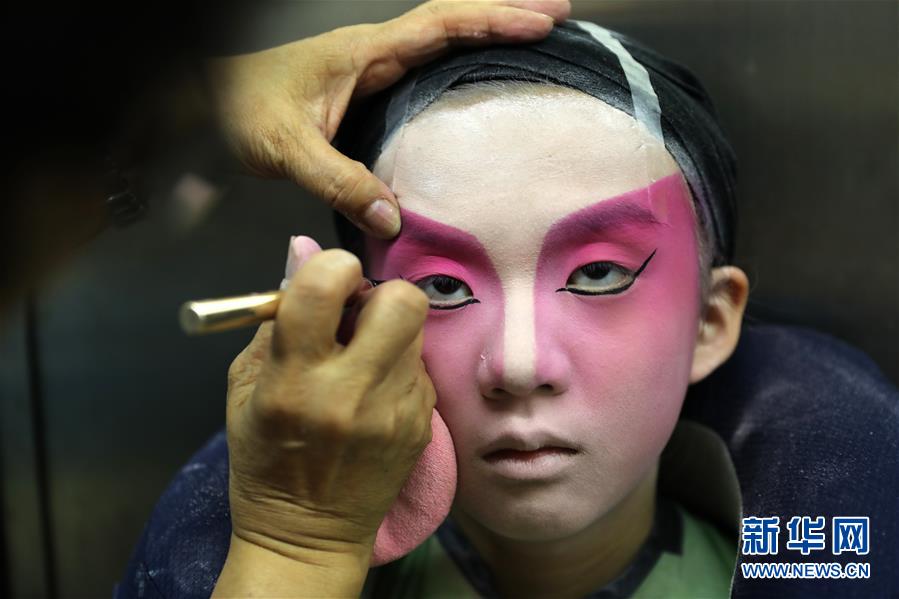 粤剧小演员陆瑞徽在画经典“红白脸”妆容(6月8日摄)。声辉粤剧推广协会成立于2003年,是香港重要粤剧艺术团体之一,致力于向青少年推广粤剧。协会目前有两个初班,3个中班,一个青少年班。粤剧又称“广东大戏”,表演技艺包括“唱做念打”,即唱功、身段、台词、武打,主要流行于广东、广西和香港、澳门等地区。2009年,粤剧被列入联合国教科文组织人类非物质文化遗产代表作名录,今年正逢十周年。新华社记者 吴晓初 摄