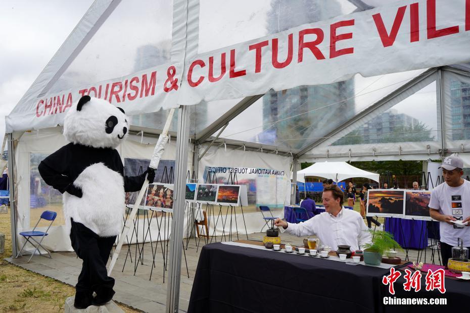 当地时间6月21日至23日,中国驻多伦多旅游办事处联合中国驻温哥华总领馆在加拿大温哥华国际龙舟节设立“中国旅游文化村”,举办“美丽中国”图片展、糖画、书法、茶艺、青花瓷绘画、长嘴壶等文化表演展示和体验。这也是为期九天的2019年加拿大“中国旅游文化周”系列活动的重要组成部分及收官节目。图为大熊猫公仔及“洋面孔”的茶艺师“坐镇”现场。中新社发 中国驻多伦多旅游办事处供图