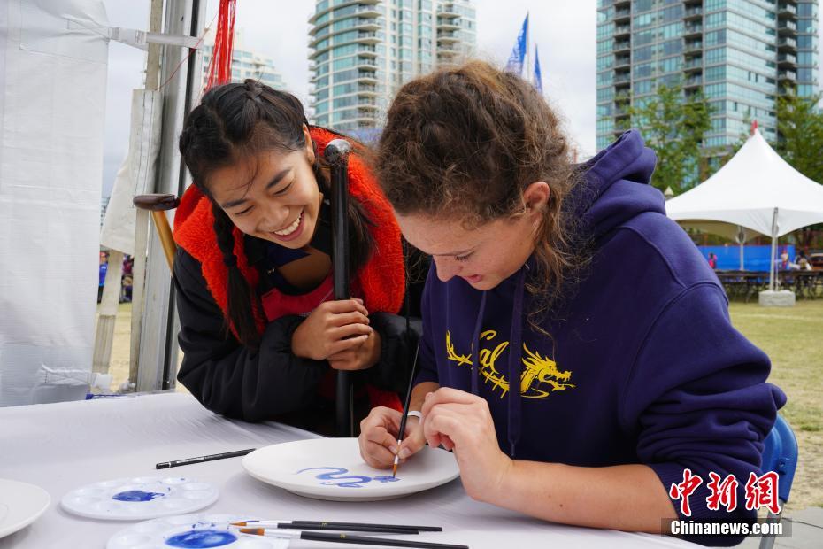 当地时间6月21日至23日,中国驻多伦多旅游办事处联合中国驻温哥华总领馆在加拿大温哥华国际龙舟节设立“中国旅游文化村”,举办“美丽中国”图片展、糖画、书法、茶艺、青花瓷绘画、长嘴壶等文化表演展示和体验。这也是为期九天的2019年加拿大“中国旅游文化周”系列活动的重要组成部分及收官节目。图为两位参加龙舟节的桨手体验青花瓷绘画。中新社发 中国驻多伦多旅游办事处供图