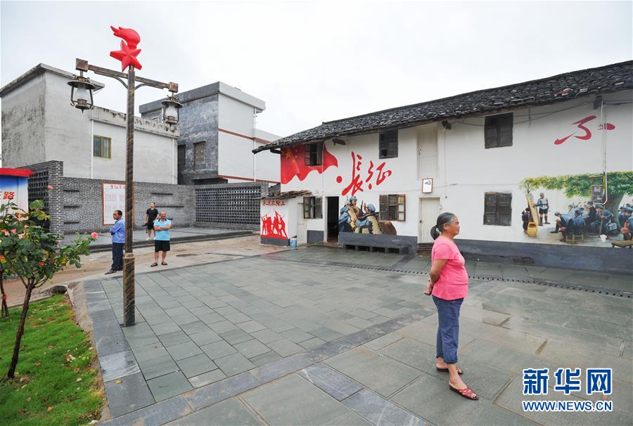 6月23日,在广东省南雄市油山镇上朔村,村民站在画有长征题材壁画的房屋前。新华社记者 李任滋 摄