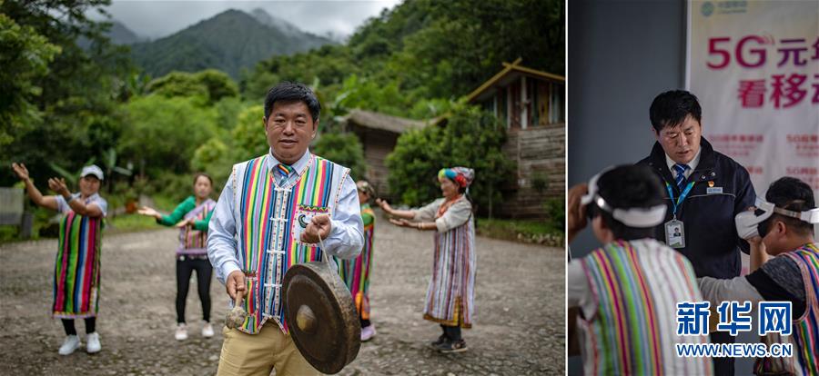 这是一张拼版照片。左图:在怒江傈僳族自治州贡山县独龙江乡移动营业厅上班的马春海(独龙族)。在他身后,独龙族群众在跳本民族舞蹈(6月21日摄);右图:马春海在指导当地群众体验5G虚拟现实。独龙江乡今年开通了5G试验基站(6月21日摄)。 新华社记者 江文耀 摄