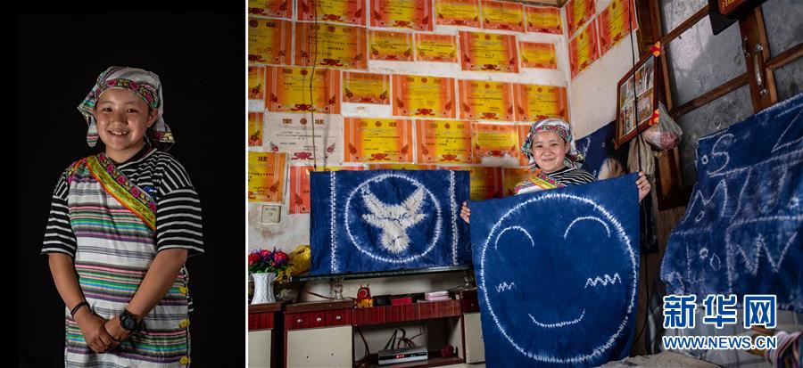这是一张拼版照片。左图:李晓娜,独龙族,今年12岁,家住云南省贡山县独龙江乡献九当村,在独龙江中心学校上五年级(6月21日摄);右图:李晓娜在家中展示自己的扎染作品(6月21日摄)。 新华社记者 江文耀 摄