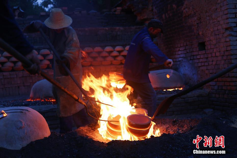 6月27日凌晨,河北张家口蔚州青砂器王氏家族第五代传承人王龙磊和工人们正在一起烧制青砂器。青砂器的烧制流程为全手工,其原材料为当地稀有的“坩子土”,通过手工制坯、炭火高温烧制、看火、出炉等工艺制作而成。中新社记者 马铭言 摄