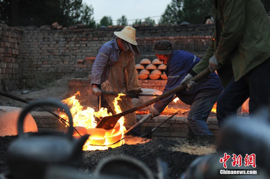 6月27日,工匠打开笼罩准备取出烧制好的青砂器。在河北省张家口市蔚县白河东村,蔚州青砂器第五代传承人——王龙磊和工匠们正在烧制青砂器。蔚县青砂器制作是“河北省级非物质文化遗产”,距今已有300多年的历史。其原材料为本地稀有的“坩子土”,手工制坯,全程13道工艺,再以1600度左右的高温烧制而成。青砂器要经过捏制和烧制,捏制分别为碾筛矸子土、和矸子泥、揉矸子泥、捏制青砂器、晾晒坯子;烧制分别为打笼盔、点火、装炉、看火、出炉、验质打包。 中新社记者 张娅子 摄