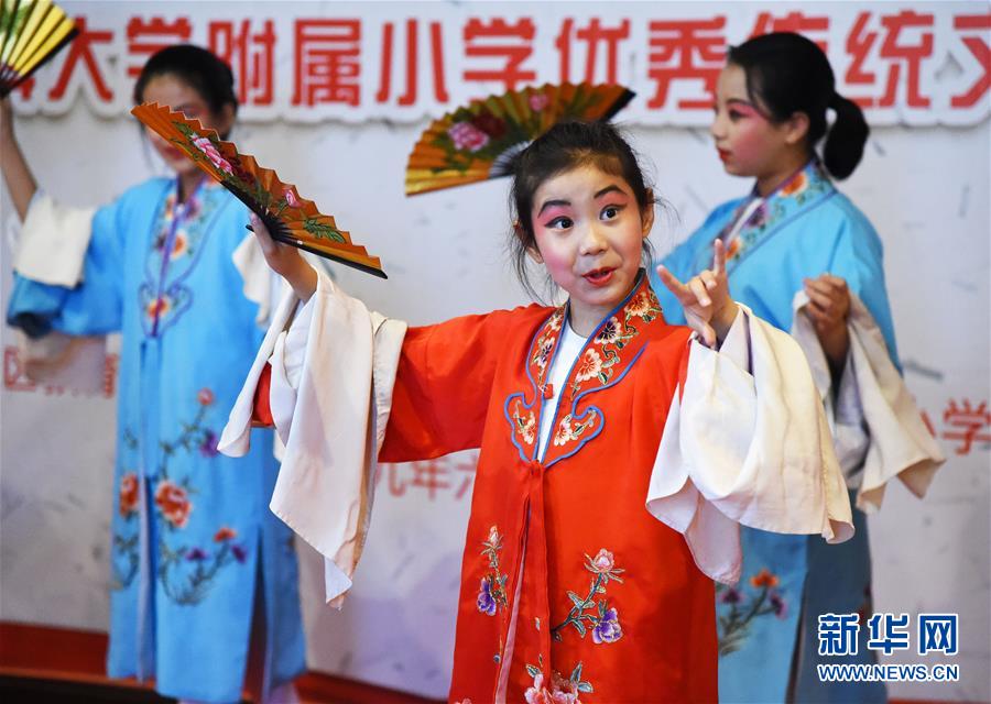 6月27日,学生在成果展中表演京剧《贵妃醉酒》选段。 当日,北京医科大学附属小学优秀传统文化课程成果展在中华世纪坛举行。本次成果展分为9大板块,共展出1500余幅(件)作品。 新华社发(任超 摄)