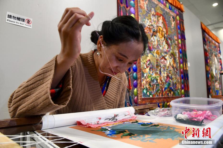 6月30日,为庆祝国庆70周年、香港回归祖国22周年,香港各界庆典委员会在全香港举行多个大型庆祝活动,其中“青海唐卡绘画艺术精品展”于香港中央图书馆举行开幕典礼,与全香港市民一同庆祝国家与香港的盛事。现场展示70多幅唐卡精品、藏族特色文化产品等,并有国家级非遗传承人现场制作唐卡,藏绣、银铜器,藏族黑陶等。图为唐卡艺术家现场制作唐卡。 中新社记者 李志华 摄