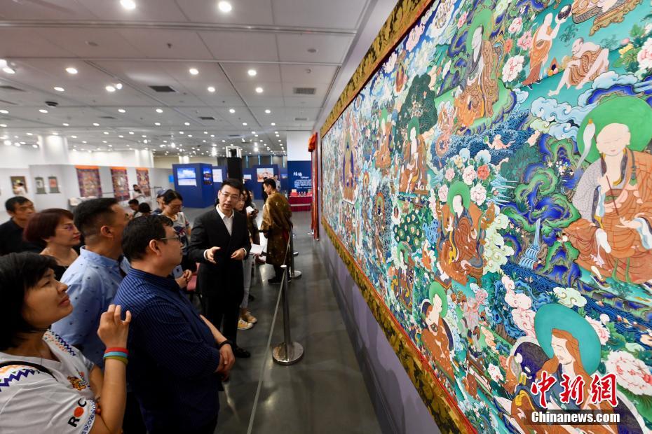 6月30日,为庆祝国庆70周年、香港回归祖国22周年,香港各界庆典委员会在全香港举行多个大型庆祝活动,其中“青海唐卡绘画艺术精品展”于香港中央图书馆举行开幕典礼,与全香港市民一同庆祝国家与香港的盛事。现场展示70多幅唐卡精品、藏族特色文化产品等,并有国家级非遗传承人现场制作唐卡,藏绣、银铜器,藏族黑陶等。图为入场人士观看展览,观赏大幅唐卡艺术品。 中新社记者 李志华 摄