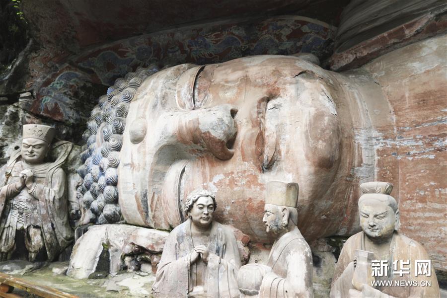 6月29日拍摄的重庆大足石刻宝顶山卧佛造像区一角。 当日,重庆大足石刻宝顶山卧佛和小佛湾摩崖造像保护修缮工程正式启动。宝顶山卧佛,佛半身卧长31米,是世界上最大的石雕半身卧佛造像,具有突出的历史、艺术、科学、宗教价值。由于卧佛暴露在露天环境中,在千百年自然营力和人为因素等影响下,石刻造像发育了多种病害。此次保护修复坚持保持现状、最小干预的原则,注重保持大足石刻宝顶山卧佛、小佛湾造像的原有历史风貌。 新华社发(黄舒 摄)