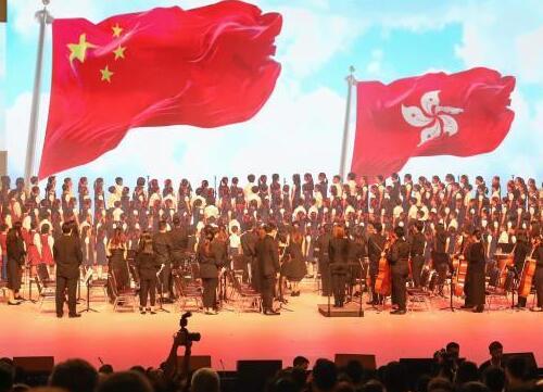 7月1日,以“跃动大湾区”为主题的庆祝香港回归祖国22周年晚会在香港红磡体育馆举行。图为演出开始前,全体起立奏唱中华人民共和国国歌。中新社记者 谢光磊 摄