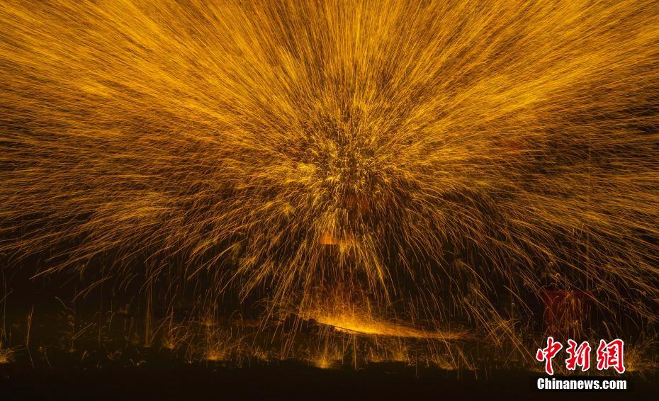 7月1日晚,河南民间打铁花艺人为江西新余市仙女湖区凯光亚热带植物园的游客表演国家级非物质文化遗产项目——打铁花。初夏时节,来自北方的打铁花表演者一展绝技,高温之下的朵朵铁花绽放夏日夜空,如天女散花般绚烂夺目,令南方游客赞叹不已。据了解,打铁花,是流传于豫晋地区民间传统的烟火,至今已有千余年的历史。赵春亮 摄