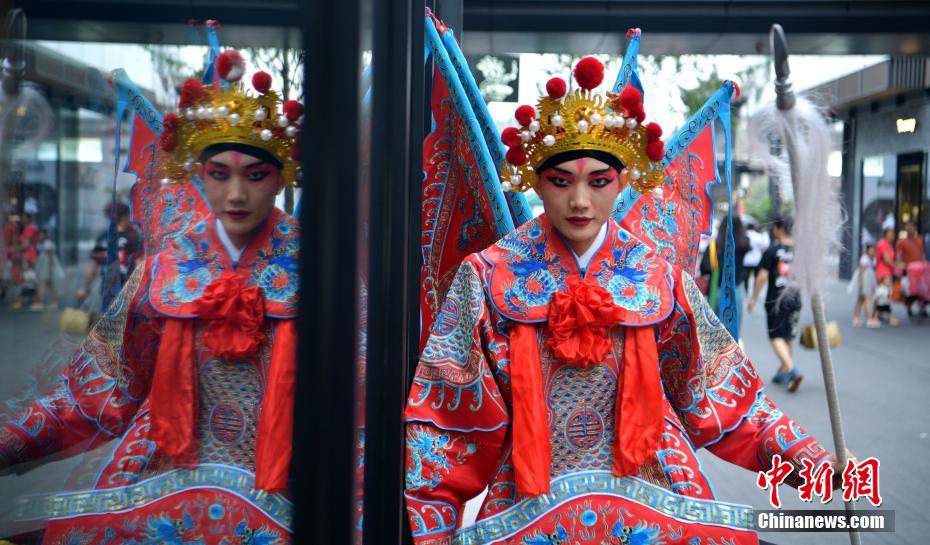 7月3日,成都春熙路太古里街头以及大慈寺内,三名身着川剧服装的青年人突然走进人群,给繁华都市和千年古刹增添了独特的文化韵味,吸引了不少过往路人驻足和拍照。图为成都街头的川剧爱好者。中新社记者 刘忠俊 摄