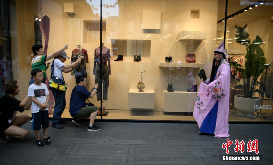 7月3日,成都春熙路太古里街头以及大慈寺内,三名身着川剧服装的青年人突然走进人群,给繁华都市和千年古刹增添了独特的文化韵味,吸引了不少过往路人驻足和拍照。图为川剧爱好者吸引过往路人拍照。中新社记者 刘忠俊 摄