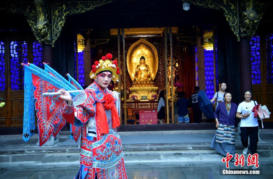 7月3日,成都春熙路太古里街头以及大慈寺内,三名身着川剧服装的青年人突然走进人群,给繁华都市和千年古刹增添了独特的文化韵味,吸引了不少过往路人驻足和拍照。图为成都千年古寺里的川剧爱好者。中新社记者 刘忠俊 摄