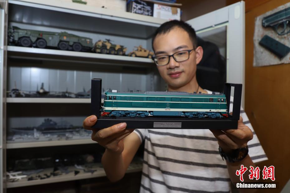7月4日,张宇琦展示他最喜欢的“NY型柴油机车”火车模型。今年 27岁的张宇琦是贵阳北动车运用所的一名动车机械师,同时他也是一个“火车迷”,从2012年开始收藏、制作各类火车模型,七年多来他已经收藏了内燃机车、电力机车等火车模型百余节。中新社记者 瞿宏伦 摄