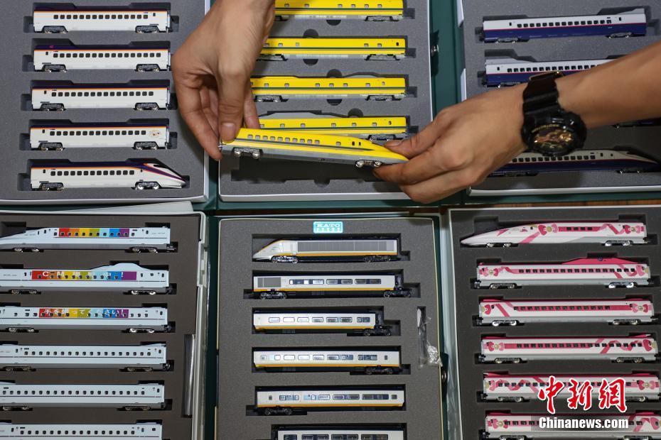 7月4日,张宇琦整理收藏的动车模型。今年27岁的张宇琦是贵阳北动车运用所的一名动车机械师,同时他也是一个“火车迷”,从2012年开始收藏、制作各类火车模型,七年多来他已经收藏了内燃机车、电力机车等火车模型百余节。中新社记者 瞿宏伦 摄