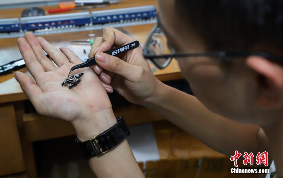 7月4日,张宇琦维修火车模型零部件。今年27岁的张宇琦是贵阳北动车运用所的一名动车机械师,同时他也是一个“火车迷”,从2012年开始收藏、制作各类火车模型,七年多来他已经收藏了内燃机车、电力机车等火车模型百余节。中新社记者 瞿宏伦 摄