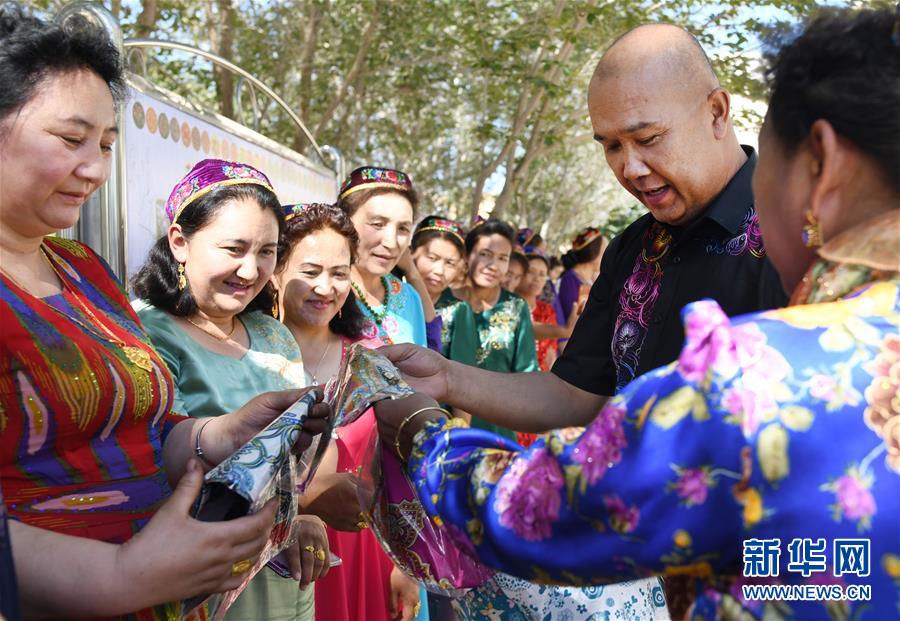 在哈密传统工艺工作站驻陶家宫手绣工坊,卡德尔·热合曼(右二)向与其合作的绣娘赠送小礼品以答谢她们近一段时间的辛苦工作(6月28日摄)。 新华社记者 王菲 摄