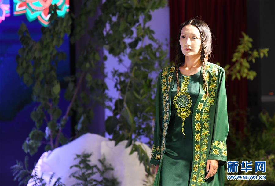在哈密传统工艺工作站,模特展示卡德尔·热合曼的手工刺绣时装作品(6月28日摄)。 新华社记者 王菲 摄