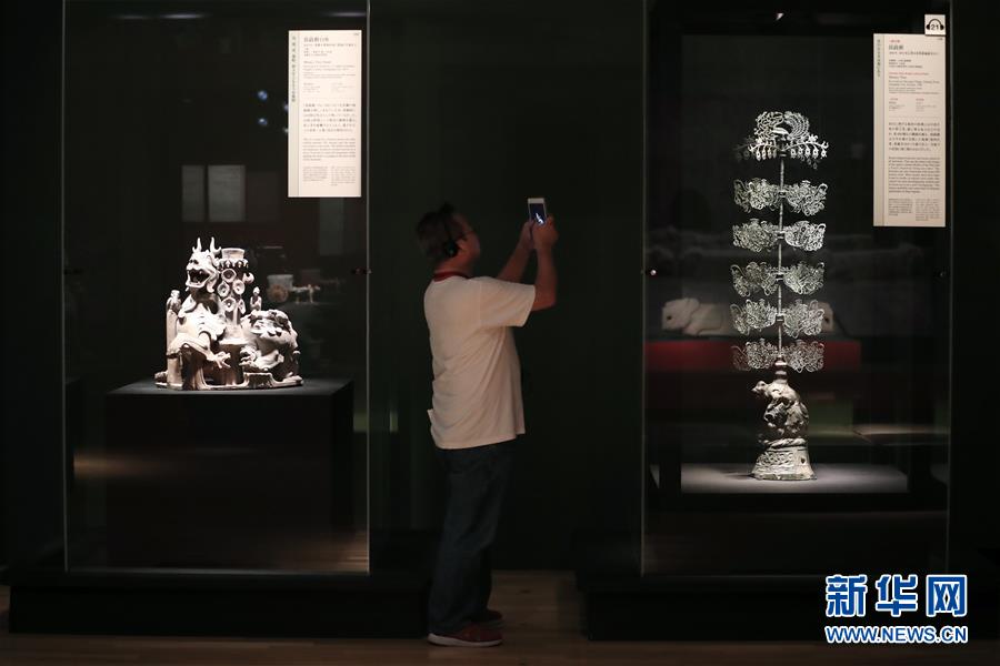 7月8日,在日本东京《三国志》展预展现场,一名观众欣赏展品“摇钱树”(右)。 中日双方共同主办的《三国志》展8日在东京国立博物馆举行开展仪式,以此纪念《中日文化交流协定》签署40周年。 新华社记者 杜潇逸 摄
