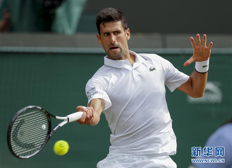 7月8日,焦科维奇在比赛中回球。 当日,在英国伦敦举行的2019温布尔登网球公开赛男单第四轮比赛中,塞尔维亚选手焦科维奇以3比0战胜法国选手安贝尔,晋级八强。 新华社记者韩岩摄