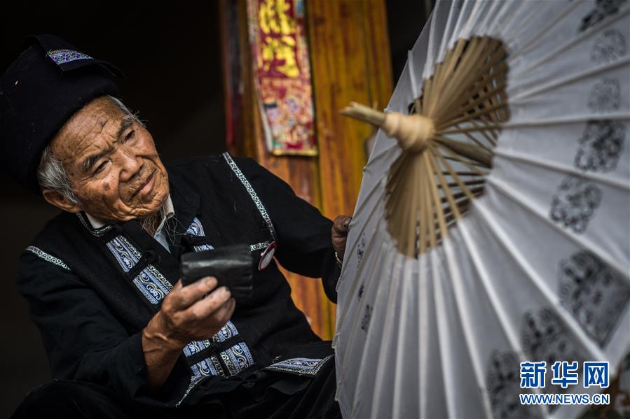 张荣华老人在给花伞印花(7月9日摄)。云南壮族水竹花伞制作技艺主要流传于云南省文山州丘北县一带,传承至今已有400余年历史。花伞选用当地优质水竹为原材料,伞架轻盈强韧,伞面油光水滑,内饰编织七彩纷呈。水竹花伞除了用作挡阳遮雨的日常用品外,也是当地嫁娶婚俗礼仪中不可或缺的物品。在丘北县官寨乡向阳村,89岁的张荣华老人和孙子张国庆是当地这一技艺仅存的传承人。锯竹、刨木、劈条、刨青、锯槽、装键、绕伞圈、裱伞、印花、穿饰线、上桐油……每把伞都要经过80余道精细繁琐的工艺,历时三至五天,纯手工制作,匠心尽显。新华社记者江文耀摄
