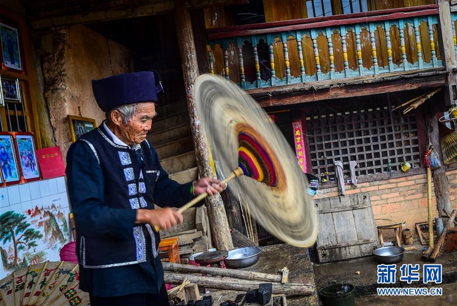 张荣华老人在试用制作完成的水竹花伞(7月9日摄)。云南壮族水竹花伞制作技艺主要流传于云南省文山州丘北县一带,传承至今已有400余年历史。花伞选用当地优质水竹为原材料,伞架轻盈强韧,伞面油光水滑,内饰编织七彩纷呈。水竹花伞除了用作挡阳遮雨的日常用品外,也是当地嫁娶婚俗礼仪中不可或缺的物品。在丘北县官寨乡向阳村,89岁的张荣华老人和孙子张国庆是当地这一技艺仅存的传承人。锯竹、刨木、劈条、刨青、锯槽、装键、绕伞圈、裱伞、印花、穿饰线、上桐油……每把伞都要经过80余道精细繁琐的工艺,历时三至五天,纯手工制作,匠心尽显。新华社记者江文耀摄