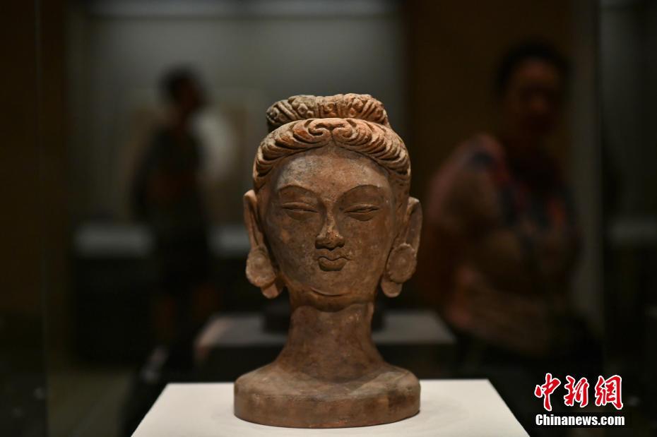 7月10日,北京,观众参观展品《彩塑菩萨头像》。“万里同风——新疆文物精品展”9日在中国国家博物馆开幕。据介绍,展览展出了191件(套)新疆各地出土的精美文物,分为“丝路雏形”“丝路华章”“丝路梵音”3个部分。展品门类丰富,包括先秦时期的彩陶、青铜器、金器、木器及毛织品,汉唐时期的锦绣丝绸、简牍文书、官府印信、彩棺、泥俑、钱币、饰品、生活器具以及佛教艺术品等。中新社记者 张兴龙 摄