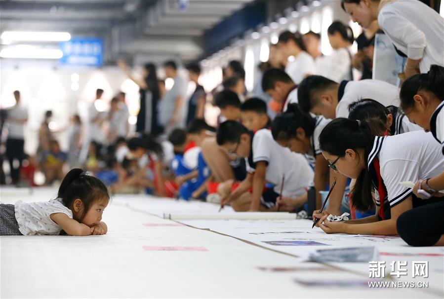 7月13日,小学生在水墨长卷绘画展示活动中作画。 当日,在山东省青岛市即墨区德馨小学西校区举行的全国中小学水墨长卷《我爱祖国》绘画展示活动上,120名学生用手中的画笔描绘祖国大好河山和巨大变化,向新中国成立70周年献礼。 新华社发(梁孝鹏 摄)